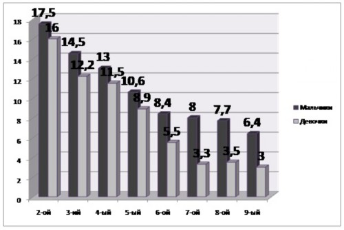 Миф 4 – Буллинг характерен для подростковой среды, в начальной школе этого феномена нет. Вот статистика изменений частоты встречаемости феномена буллинга по классам по данным Д.Оллвеуса.